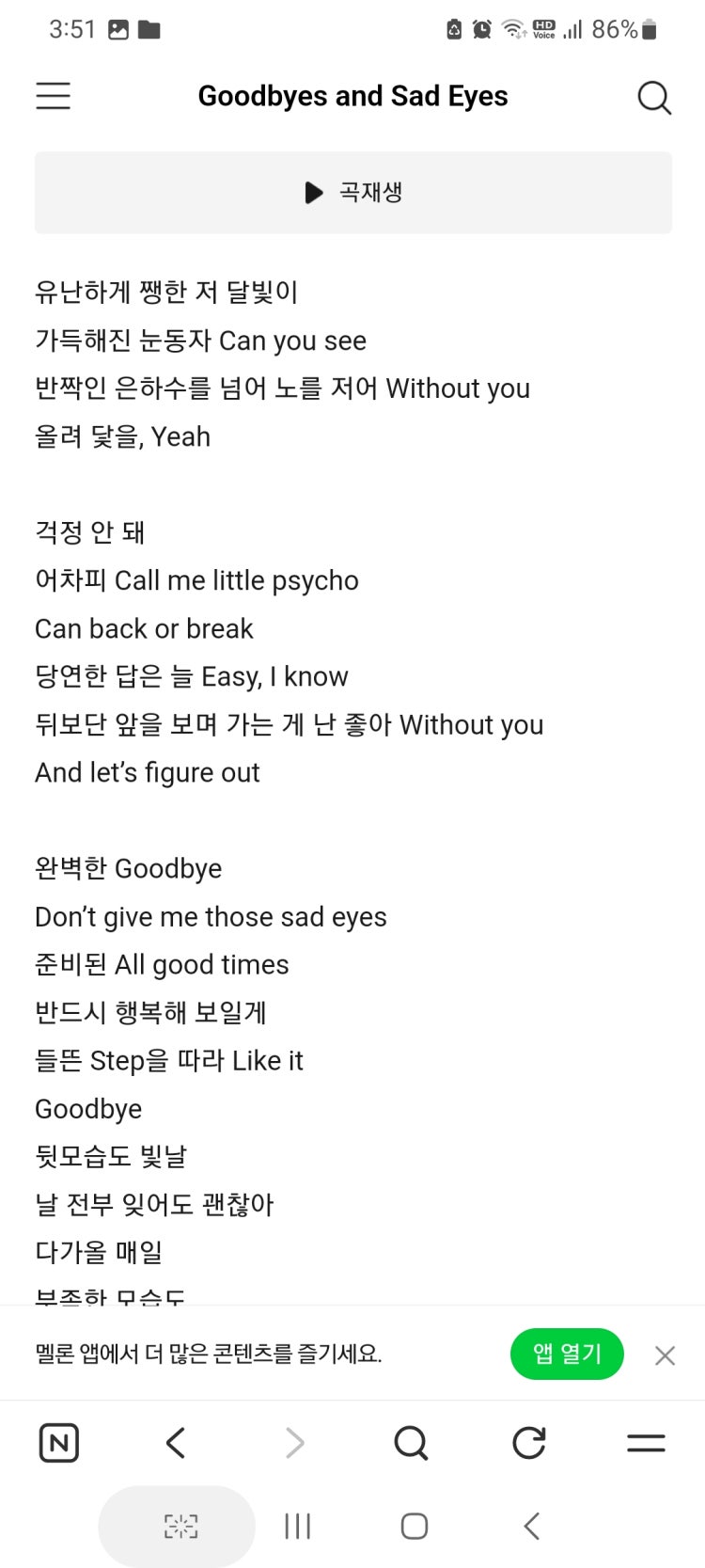 여돌 아니면 여자솔로인 것 같은데 후렴 들어가기 전에 without you without you 하고 들어갑니다. 제대로는 못들어서 들리는 대로 적어본겁니다. 후렴은 완벽한 굿바이 don't give me a goodbye ~~해도 괜찮아 어차피 ~~~very very like it 막 이랬던 것 같습니다..;; 알바하면서 맨날 듣는건데 스피커가 안좋아서 가사를 전혀 모르겠네요