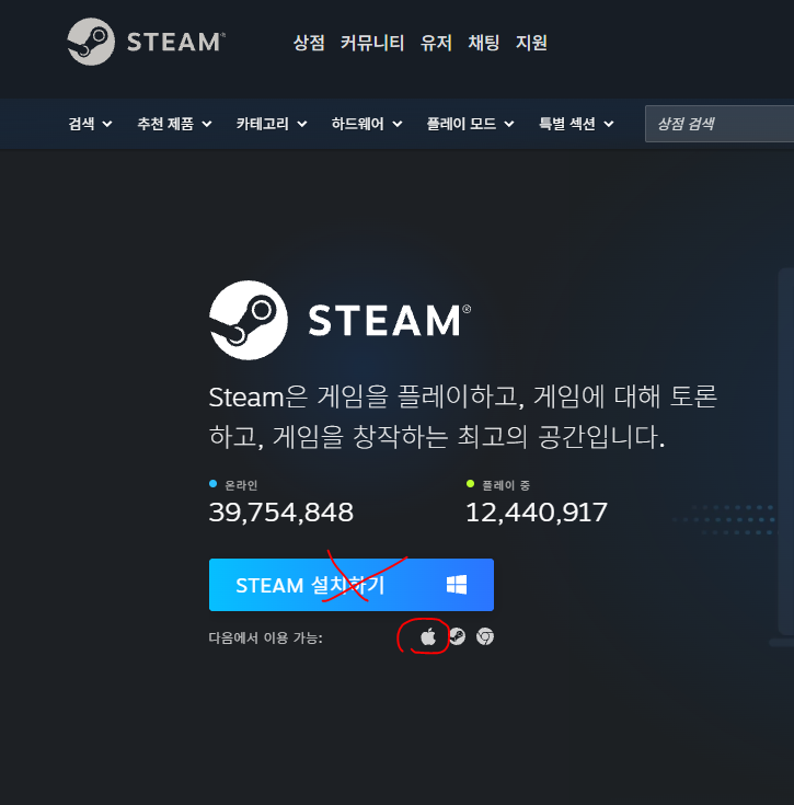 스팀 설치 할때 윈도우 마크 말고 사과 표시를 눌러서 설치를 하셔야 되요