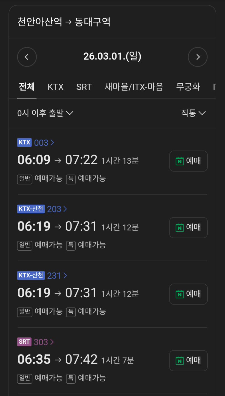없습니다 그냥 천안아산역에서 동대구역 가는 ktx 이용해서 가는게 훨씬 나을듯