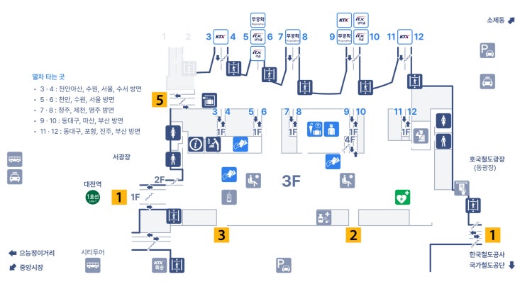 우선 대전역은 1층에 승강장들이 있고, 다른 승강장으로 이동하려면 3층(맞이방)으로 올라와서 다시 내려가야 합니다(맞이방으로 나가지 말고 선상통로로 이동하면 됩니다).