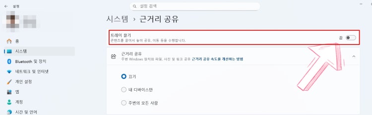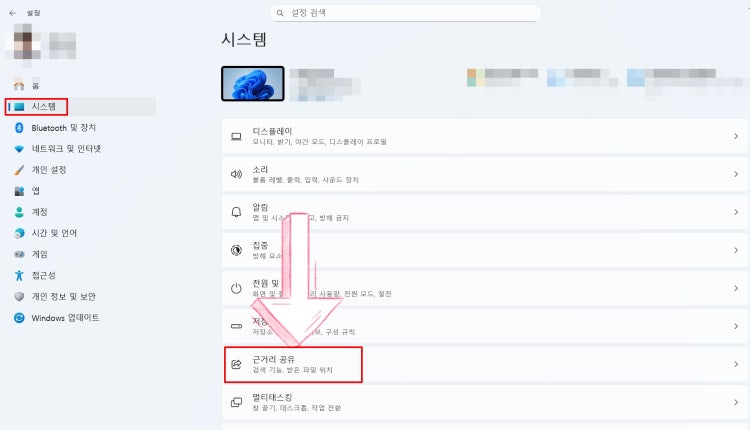 설정창을 열고 시스템 >> 근거리공유르르 클릭해서 들러갑니다.