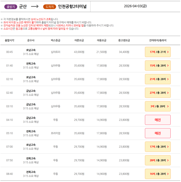29일 오사카 부산에어 12시 40분 비행기를 타는데 전북 군산에서 7시 공항버스 타고 가면 늦을까요 ?