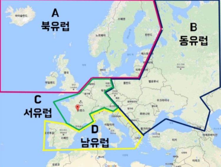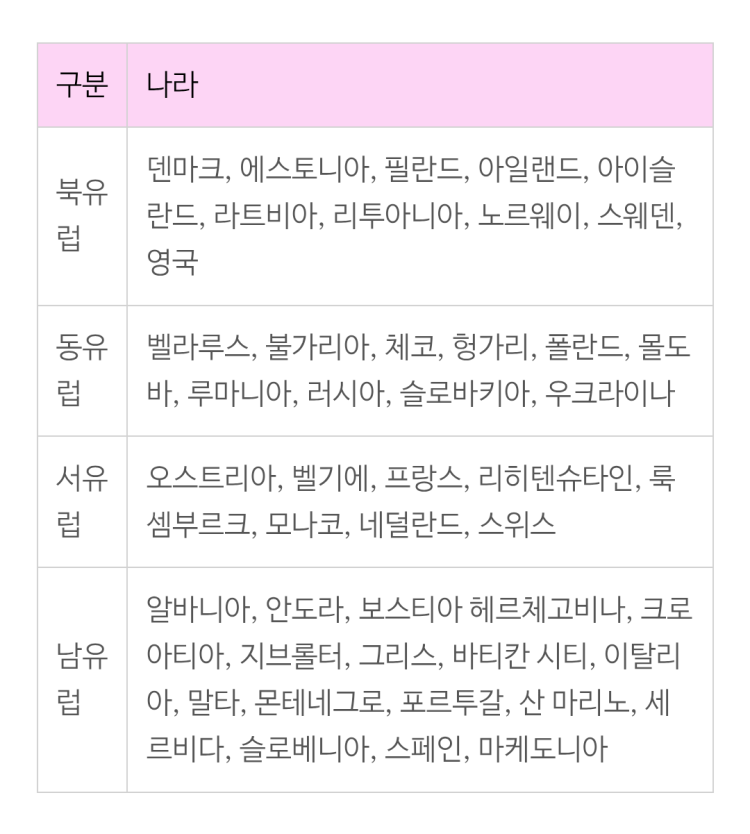 어느 나라를 기준으로 서유럽과 동유럽, 남부유럽으로 구분하는 거예요? 어떤 나라가 서유럽이고 동유럽인지 구분을 잘 못해서요..