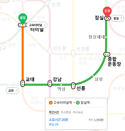 2. 교대역에서 강남역 방향으로 2호선 환승해서 잠실역에서 하차