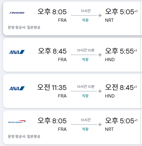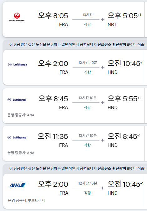 항공 노선 등을 샅샅이 찾아보면서 프랑스-일본 직항 노선과 독일-일본 직항 노선을 확인해보니 프랑스 기준으로는 샤를 드골 공항에서 간사이&하네다 공항이 있는데 독일 기준으로는 프랑크푸르트&뮌헨 공항에서 간사이&도쿄(하네다&나리타) 이렇게 있어도 운항 횟수 및 항공편은 구체적으로 알려주시겠어요?
