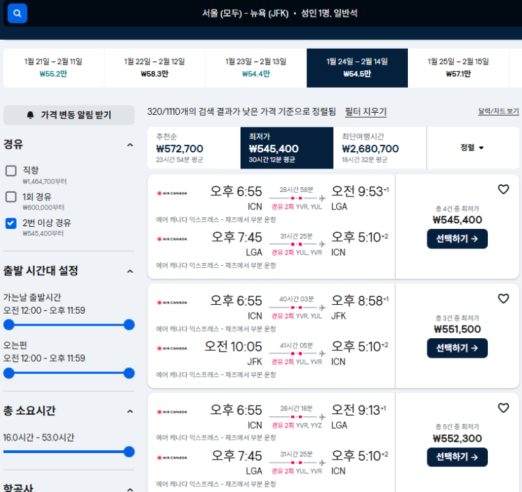 에어캐나다 로 2회 경유로 항공료가 직항의 1/4 정도로 저렴합니다.