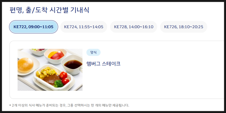 대한항공에서는 햄버그 스테이크를 제공하는데 아시아나항공은 따로 메뉴공지를 하지 않고있습니다.