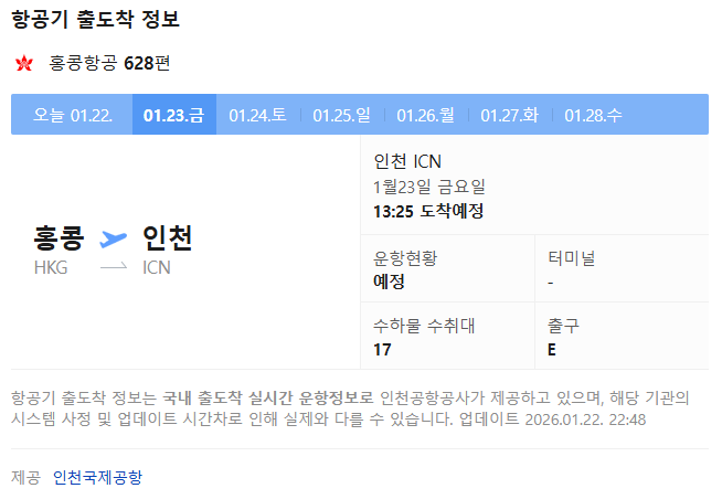 해당 운송장은 한진택배 800972352600으로 변경되어 국내 배송이 진행될 예정입니다. 항공기 운항 정보를 확인해 보니, 물품을 실은 홍콩항공 HX628편이 1월 23일(금) 오후 13시 25분에 인천국제공항에 도착할 예정입니다.