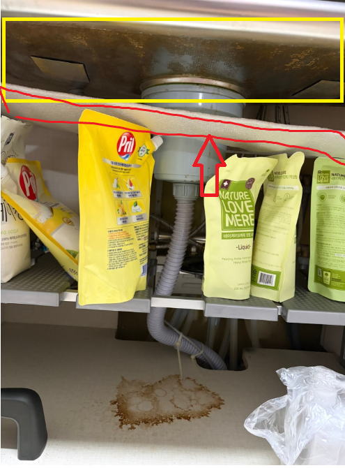 싱크대 하부장 3.4년전 이사오면서 부엌 인테리어 싹 한건데 뭐가 흘러요 많이는 아닌데