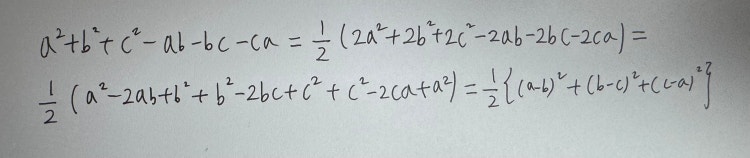 밑에 사진에잇는 식이 어떻게 나온건지 모르겟어요ㅜㅜa^+b^+c^ = (a+b+c)^ -2(ab+bc+ca)라는 식에서 변형된거란 말이에요근데 저 식까지는 이해했는데변형된 저 식이 이해가안가요ㅜㅜㅜㅜ갑자기 (a-b)^, (b-c)^, (c-a)^이 어디서 나온거죠ㅜㅜ?자세하게 설명부탁드려여..ㅜㅜㅜㅜ