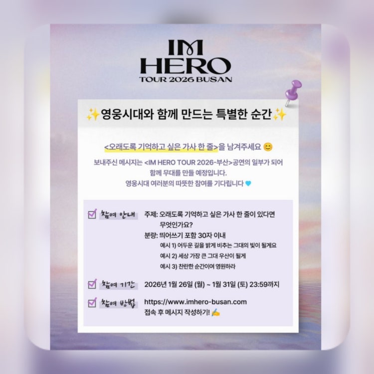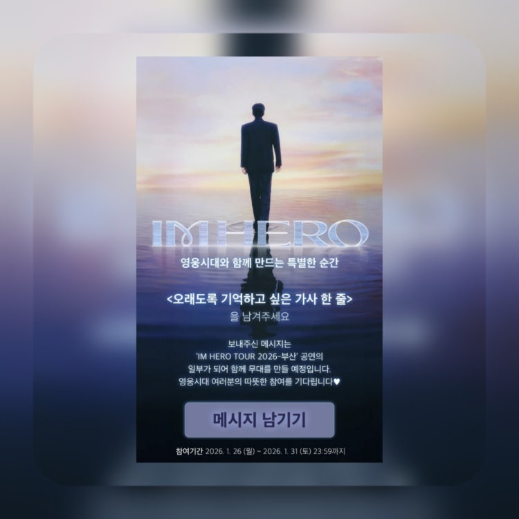 임영웅 부산콘 메시지 이벤트 참여하고 싶은데요 임영웅 부산콘서트 메시지 이벤트요? 참여하고 싶은데 정보 좀 알수있을까요?