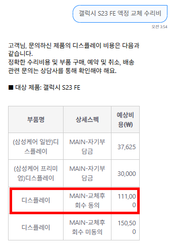 갤럭시 S23 FE 공식 서비스센터 액정 교체 비용은 약 111,000원이며, 사설 수리점에서는 대략 절반 수준으로 교체가 가능합니다.