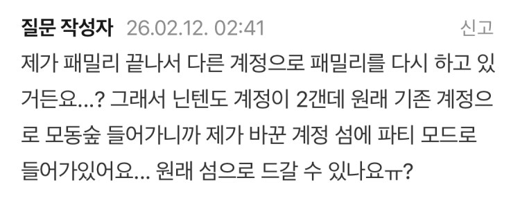 모동숲 닌텐도 패밀리... 모동숲 닌텐도 패밀리를 했다가 1년 끝나서 패밀리가 없는 상태가 되었는데