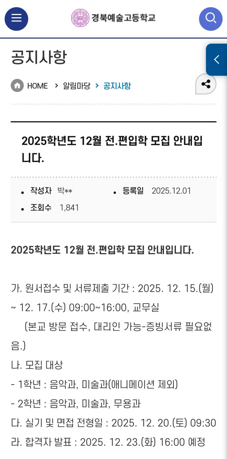 경북예고 편입 이제 고등학교 올라가는 예비 고1입니다대구에 있는 경북예고 2026학년도는 편입생을 받지